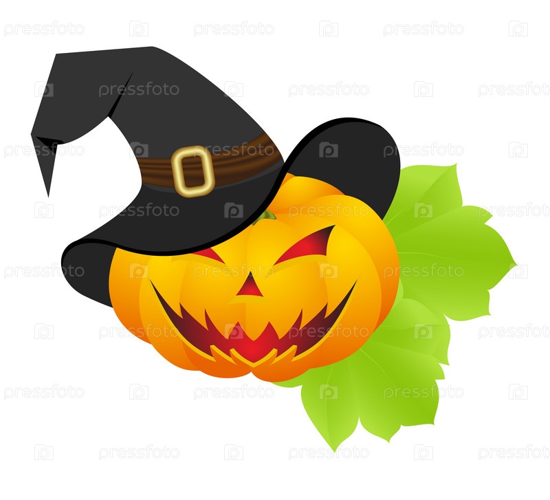 Хэллоуин. Зловещая тыква в шляпе ведьмы. Изолированная на белом фоне. Векторные иллюстрации