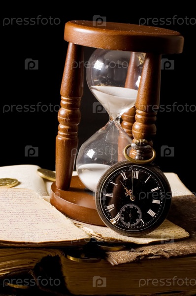 Песочные часы и механические часы на книге