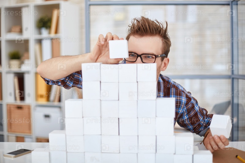 Мужчина складывает кубики