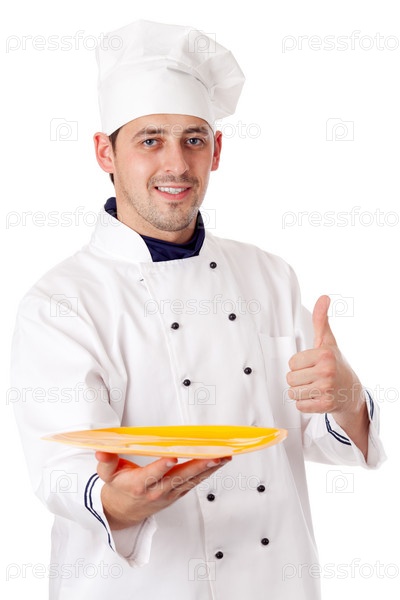 Шеф-повар с пустой тарелкой, изолирован на белом