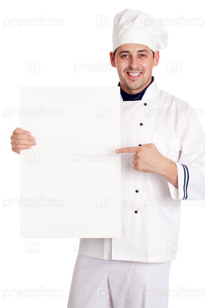 Шеф-повар с меню, изолирован на белом фоне, шаблон