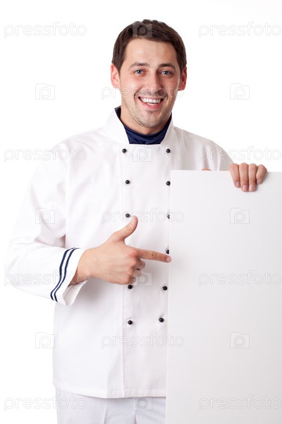 Шеф-повар с меню, изолирован на белом фоне, шаблон