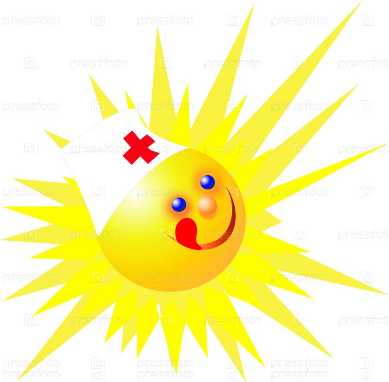 Мультяшное солнышко в медицинской шапочке показывает язык. Изолированное на белом фоне