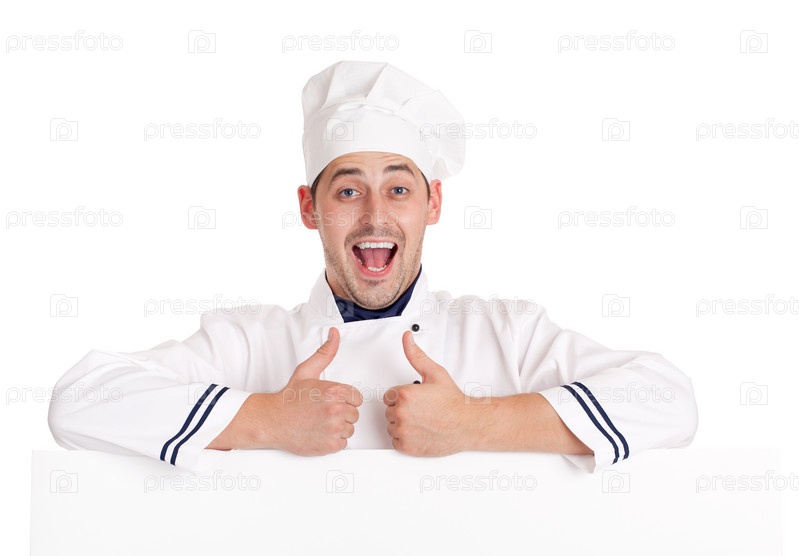 Радостный повар на белом фоне