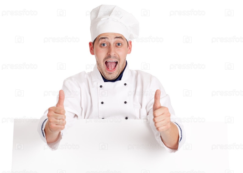 Радостный повар на белом фоне