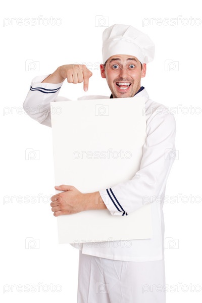 Радостный повар с меню на белом фоне