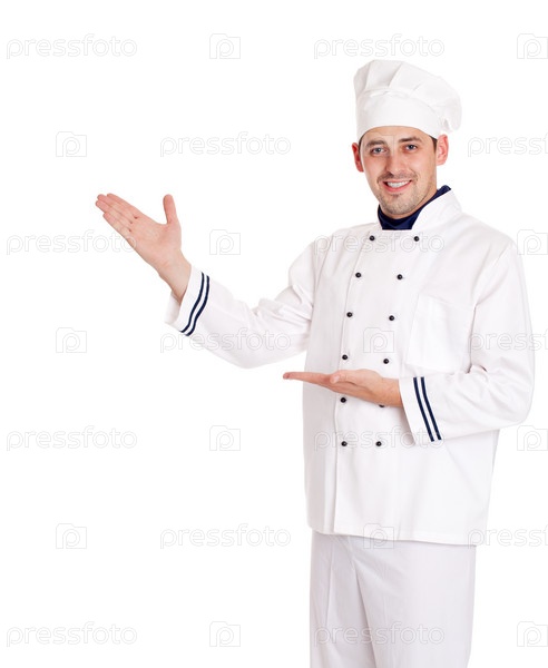 Повар делает приглашающий жест руками на белом фоне