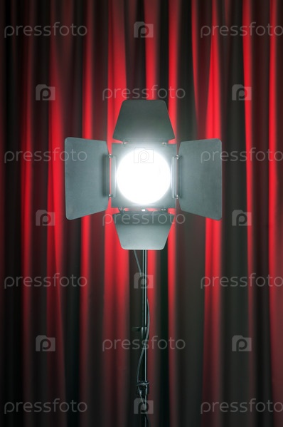 Включенный прожектор на фоне красного занавеса