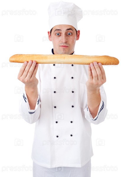 Удивленный пекарь с багетой. Изолированный на белом фоне