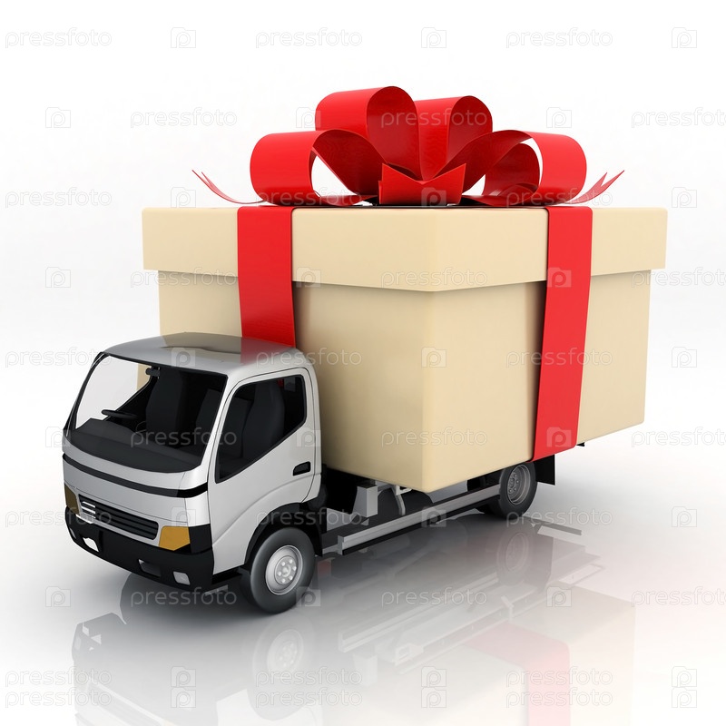 Камаз везет подарочную коробку с красным бантом. Изолированный на белом фоне