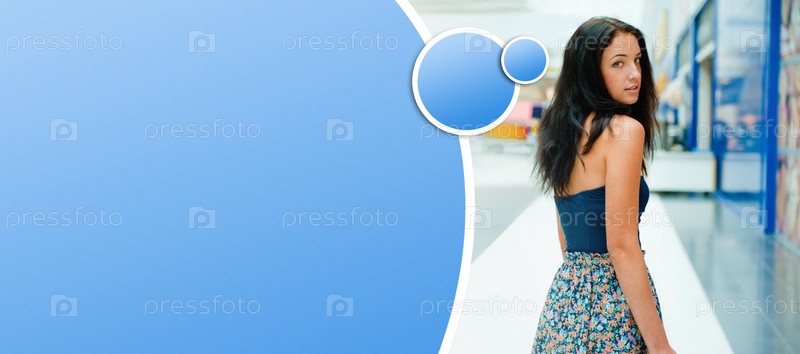 Портрет красивой молодой женщины в торговом центре с пустым синим воздушным Copyspace для вашего текста и логотипа