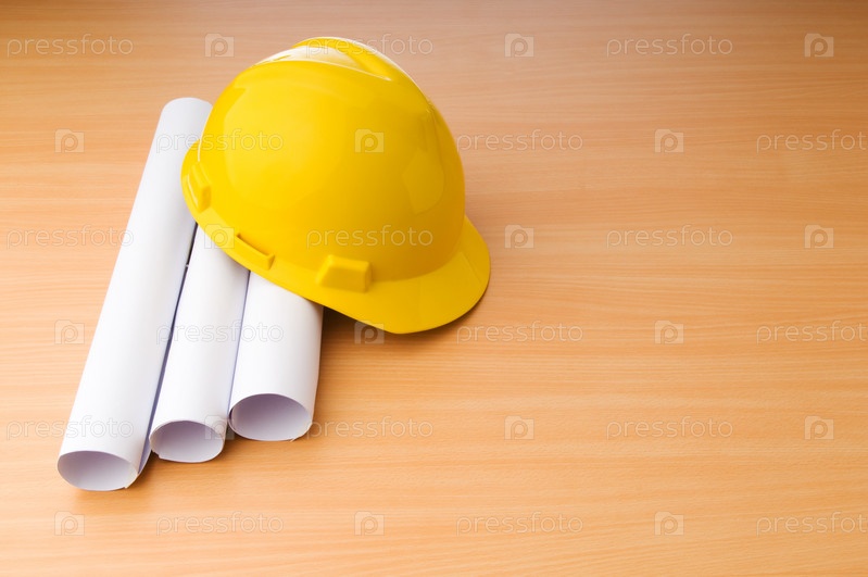 Чертежи и каска на столе