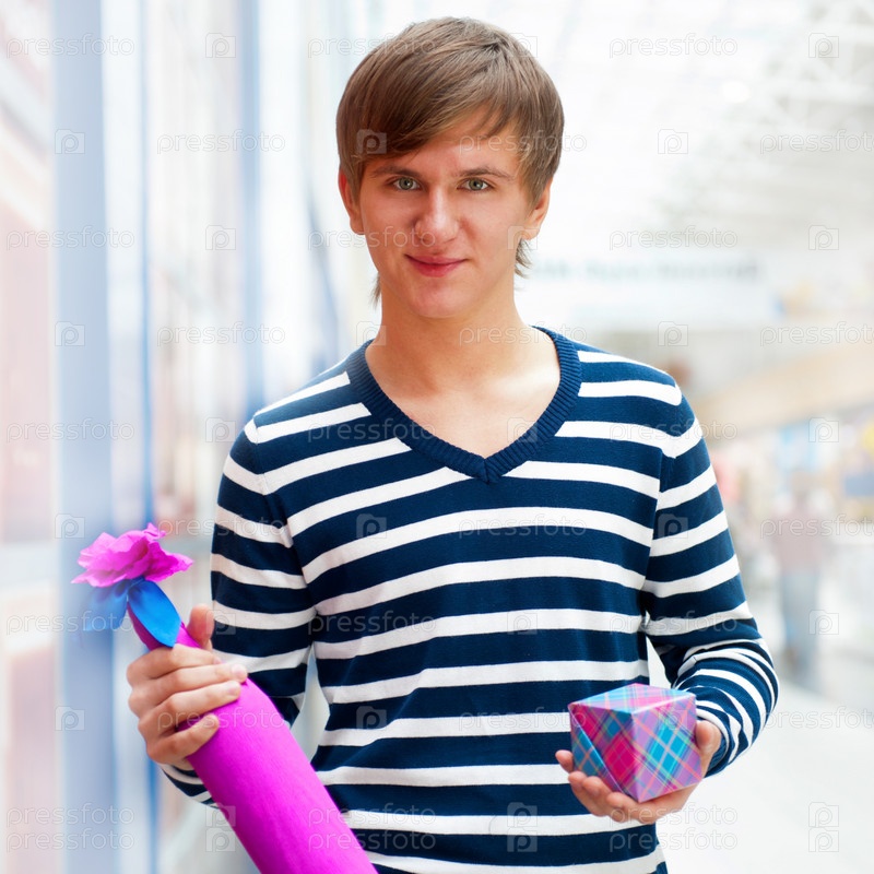 Портрет молодого парня с подарком и бутылкой в руках