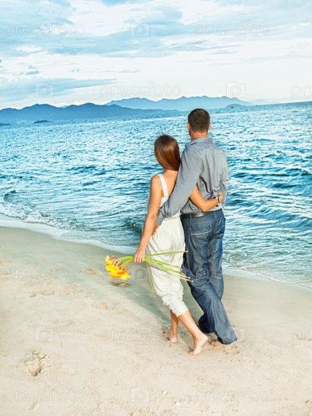 Портрет молодой пары, гуляющей по берегу океана