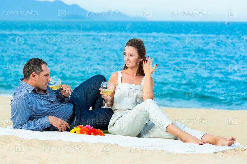 Портрет молодой пары, сидящей на берегу океана