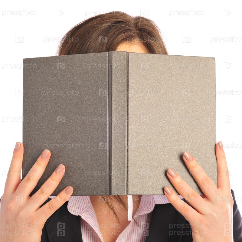 Женщина скрывает лицо серой книгой, изолированная на белом фоне