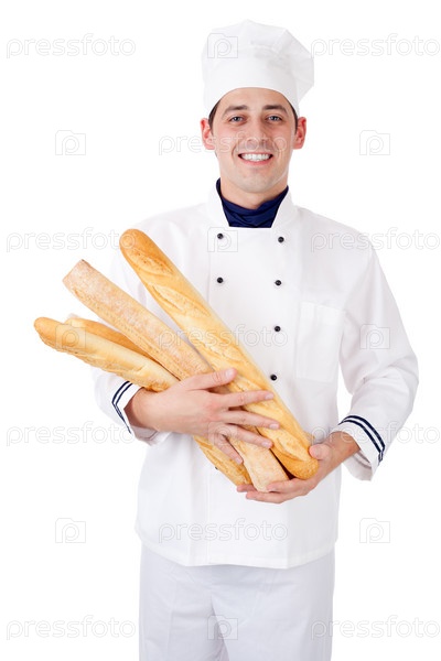 Пекарь с французскими багетами в руках