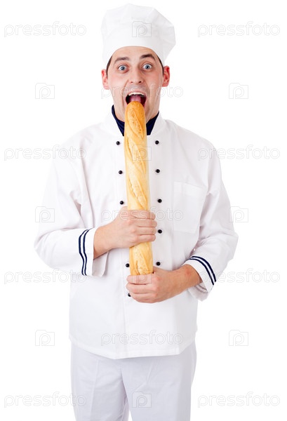 Пекарь ест французский багет