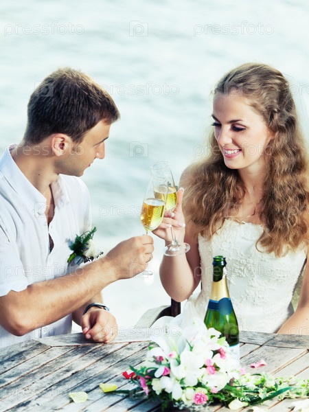 Портрет жениха и невесты, сидящих за столом на берегу моря