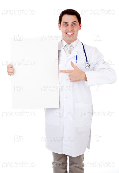 Мужчина-врач указывает пальцем на пустой плакат