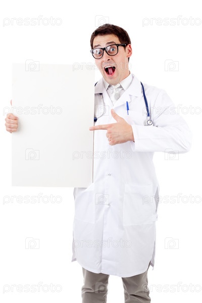 Мужчина-врач указывает пальцем на пустой плакат