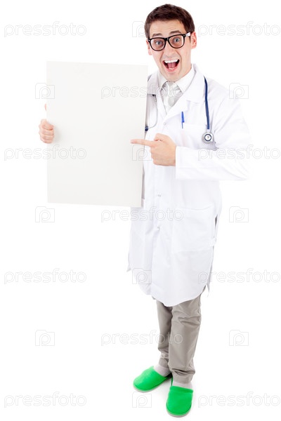 Мужчина-врач указывает пальцем на пустой плакат