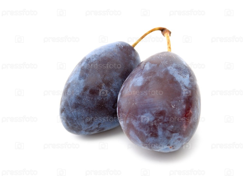 Две спелые сливы на белом фоне
