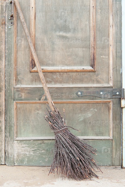 Метла на фоне старой деревянной двери