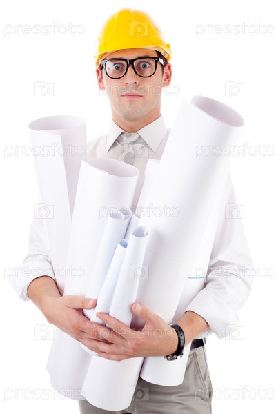 Молодой человек в каске и с чертежами на белом фоне