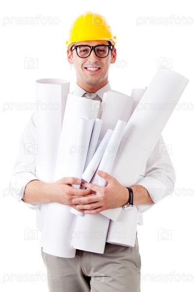 Молодой человек в каске и с чертежами на белом фоне