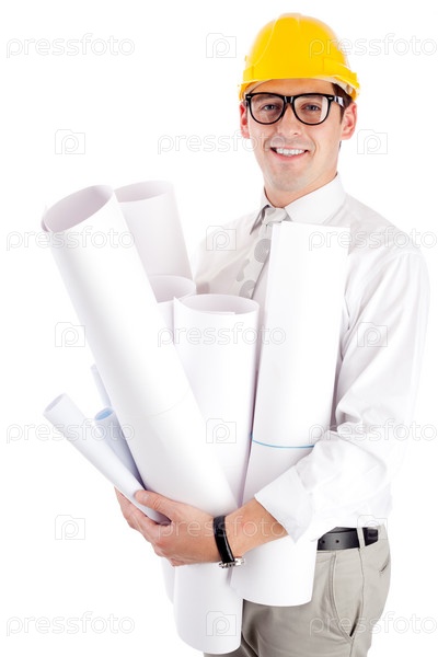 Молодой человек в каске и с чертежами на белом фоне