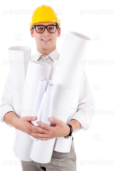 Молодой человек в каске и с чертежами на белом фоне