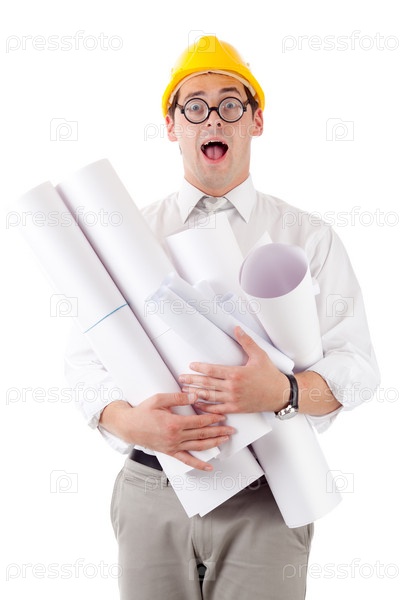 Молодой человек в каске и с чертежами на белом фоне
