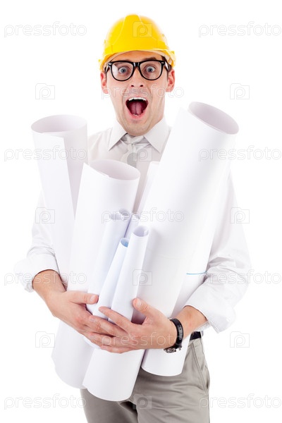 Молодой человек в каске и с чертежами на белом фоне
