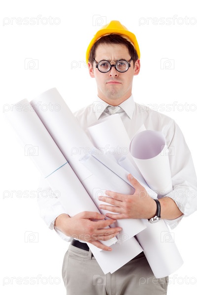 Молодой человек в каске и с чертежами на белом фоне