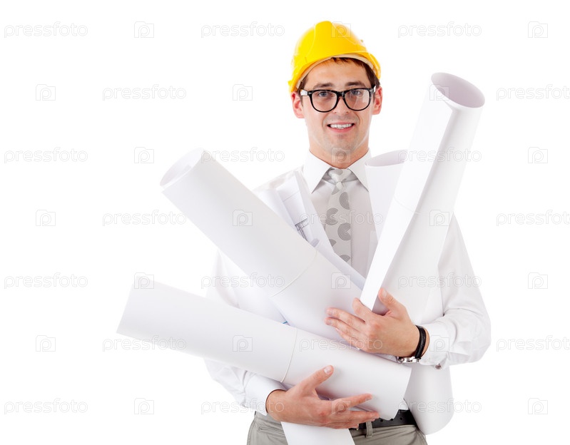 Молодой человек в каске и с чертежами на белом фоне