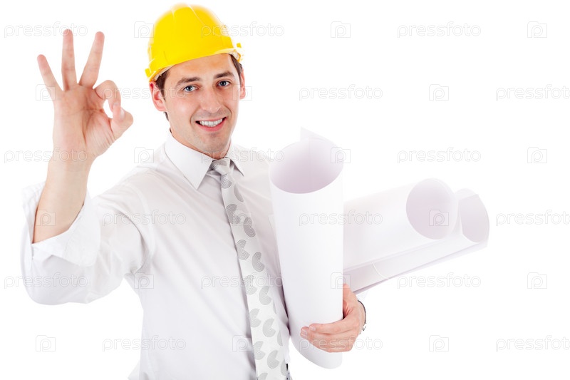 Молодой человек в каске и с чертежами показывает жестом "Ок", на белом фоне