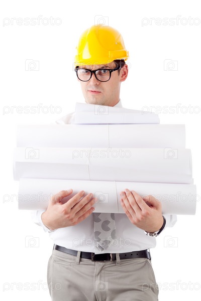 Молодой человек в каске и с чертежами на белом фоне
