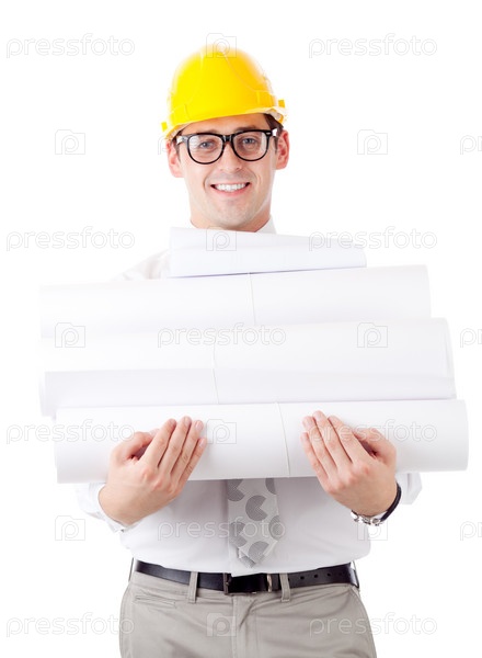 Молодой человек в каске и с чертежами на белом фоне