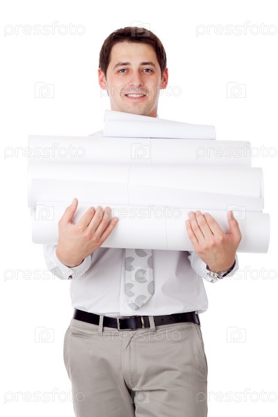 Молодой человек с чертежами на белом фоне