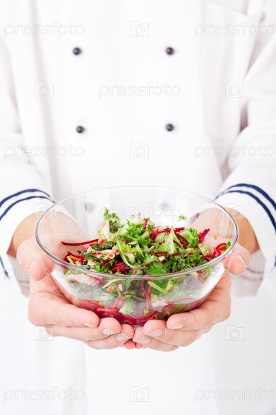 Повар держит в руках миску с салатом