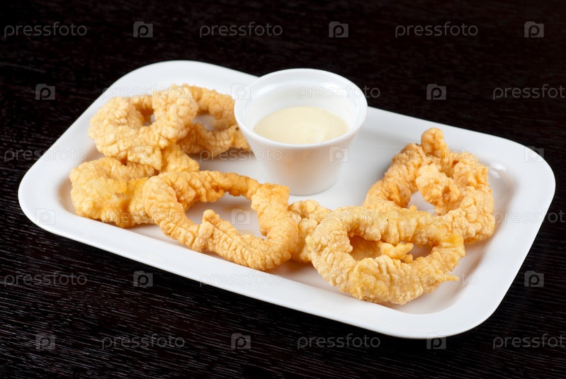 Жареный кальмар с соусом на белом блюде