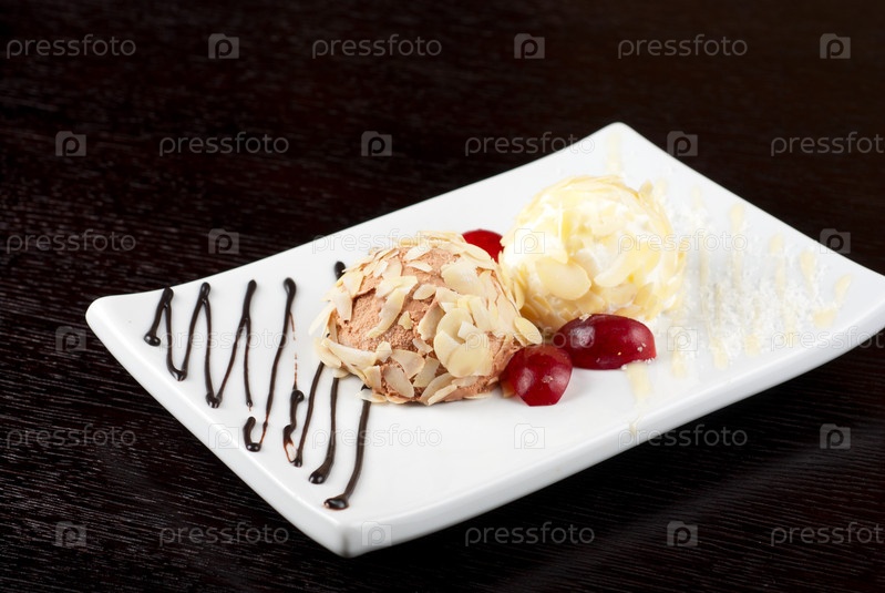 Шарики миндального и шоколадного мороженного на белом блюде