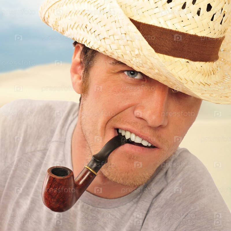 Мужественный портрет. Американский фермер в ковбойской шляпе с трубкой. Крупный план
