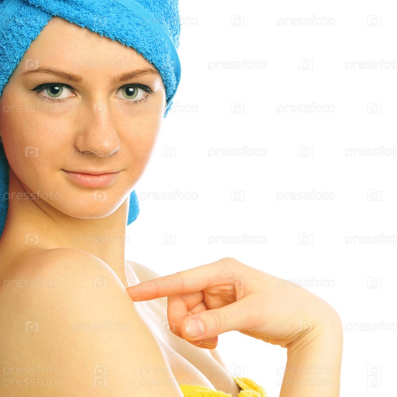 Портрет привлекательной девушки с полотенцем на голове после душа. Изолированная на белом фоне