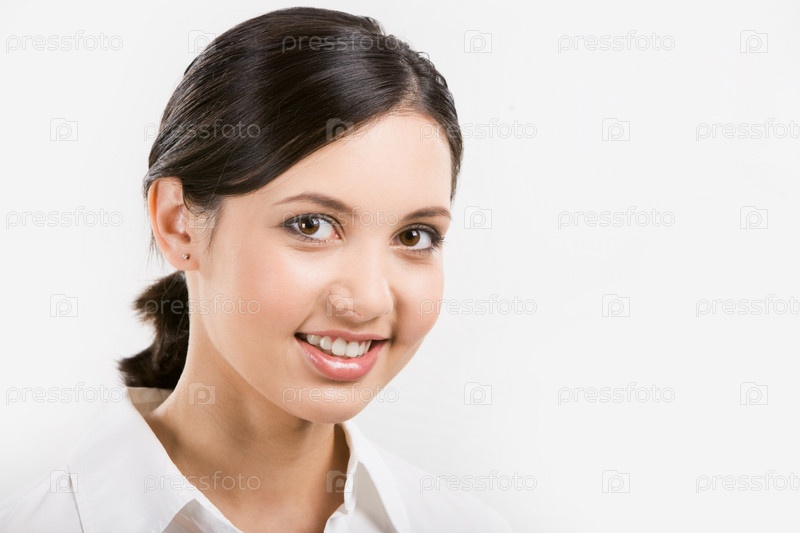 Лицо красивой девушки, глядящей в камеру на белом фоне