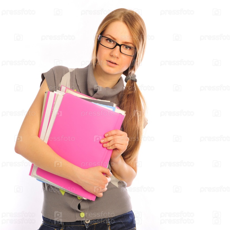 Серьезная студентка в очках с розовыми папками. Изолированная на белом фоне