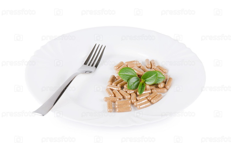 Таблетки и зеленый росток на тарелке