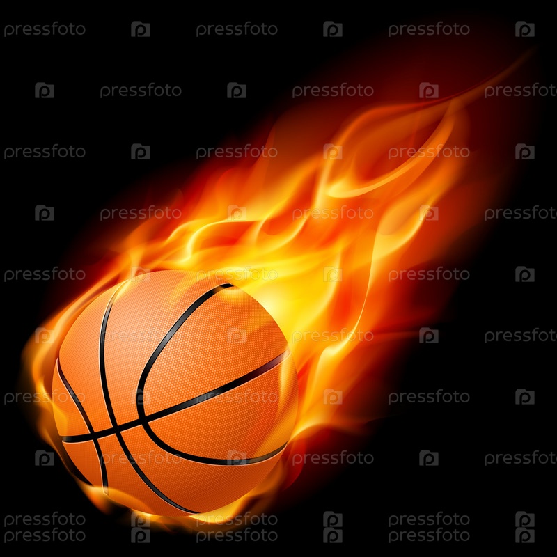 Летящий баскетбольный мяч в огне. Иллюстрация на черном фоне