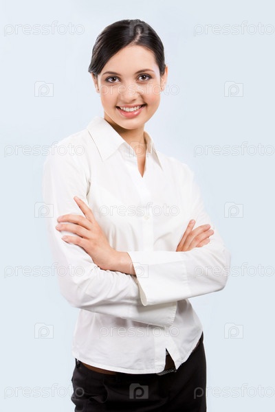 Портрет элегантной деловой женщины с перекрещенными руками на белом фоне